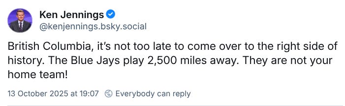 The all-time Jeopardy! champion turned host suggested last week that British Columbians should jump aboard the Seattle Mariners bandwagon in the ongoing American League Championship Series against the Toronto Blue Jays due to our closer geographic proximity.