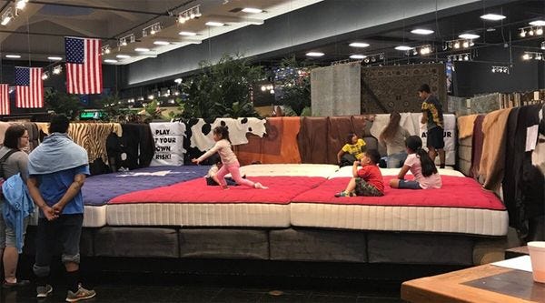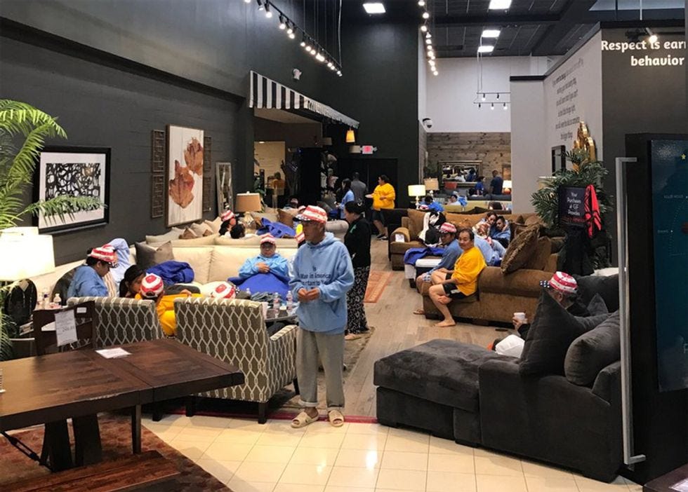 Jim McIngvale, owner of Gallery Furniture in Houston, has opened up his two furniture stores to house people seeking shelter from the storm. Again! After Katrina, he took in people who had fled New Orleans, and now he's letting people from his own city park themselves on his couches, beds, and dinette sets as long as they need some temporary shelter. He told CNN's Alysin Camerota he's putting up 360 people in one store, and about 400 in the other, adding, "So we've got lots of people displaced from the horrible flooding and we're thrilled to have them."