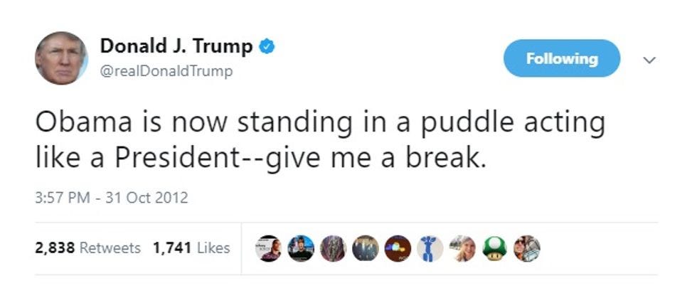 But we're not here to talk about that, or Melania's flood-appropriate stiletto heels, either (Message: I'm Not Even Pretending I Care). No, we're here to now praise excellent ordinary people who are just out there getting muddy and wet and helping, because that's what you do, as that puddle-standing guy reminded us yesterday, while also reminding us what a president sounds like: