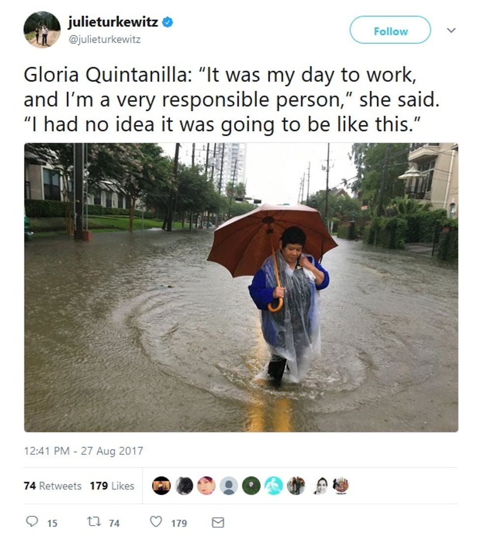 For instance, there's Gloria Quintanilla, 60, whom a New York Times reporter found walking down a flooded street after wading a mile through the flood to get to her $10-an-hour job at a hotel, where she works ironing and folding sheets: