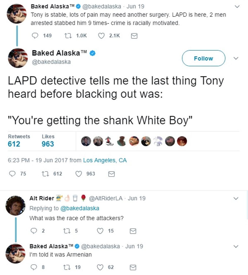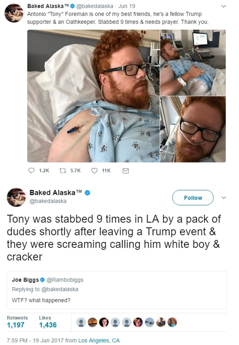 There's this tough guy named Tim Gionet, see? Posts on Twitter as "Baked Alaska." He's the mug who was given the heave-ho from the big pre-inauguration DeploraBall for being too openly Nazi-like for the taste of fascist-lite yegg Mike Cernovich. He's a big cheese in the small world of basement-dwelling anime fapping cake-sniffers in the "alt-right." So this Gionet character says his bodyguard, Antonio Foreman, got in a scrape and was the victim of an anti-white, anti Trump "hate crime" Saturday night, when Foreman was stabbed after an argument with two skels in a parking garage. The toughs who got braceleted, Edgar Khodzhasaryan and Arsen Bekverdyan, are cooling their heels on charges of attempted murder and assault with a deadly weapon, but the coppers aren't buying the hate crime claims.