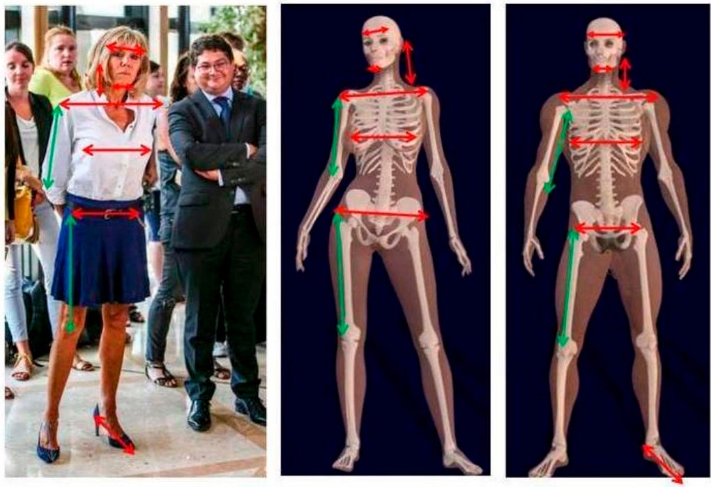 The allegations are as easy to debunk as they are batshit stupid. Mrs. Macron’s brother is alive and has been for 80 years, and stood next to the president and First Lady at Macron’s presidential inaugurations in both 2017 and 2022. Mrs. Macron (née Trogneux)’s birth announcement appeared in the local newspaper. Her ex-husband was named on their children’s birth certificates, and there’s plenty of photos and other documentary evidence he existed, because he did! There’s publicly available photos of Mrs. Macron’s neck all over. Et cetera!