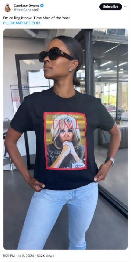 She posted a picture of herself and sold a T-shirt showcasing a fake Time magazine “Man of the Year” cover featuring Mrs. Macron. Just to profit off of her lies some more.
