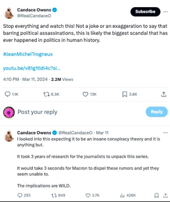 And once on her own show, free from the oppression of Ben Shapiro’s censorship, she ran even harder with the Macron fantasmes fous, interviewing Poussard on her show and posting on X: