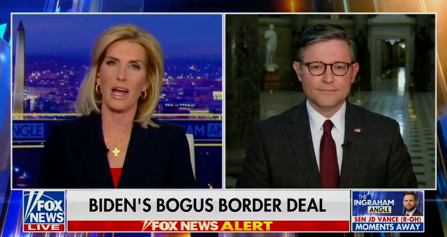 During an appearance Wednesday night on “The Ingraham Angle,” Johnson admitted that he’s actively taking instruction from Trump, whom he speaks with “frequently.” Trump told him to oppose any deal because he doesn’t need any new legislation to lock up children secure the border. Trump’s a presidential candidate who is currently on trial for treason-related activities so it’s not a shock that he’d openly undermine the sitting government. Republicans claim the border is an escalating national security threat, but Trump wants no movement made until after the election.
