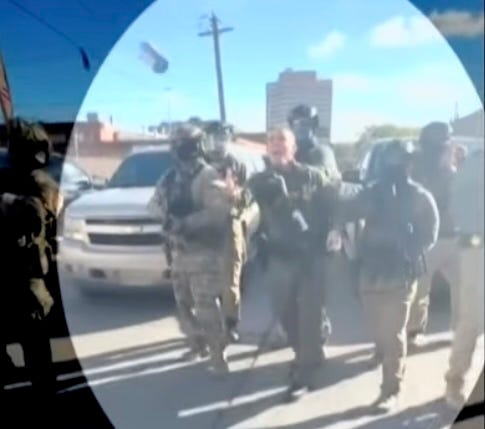 Then Bovino skittered out of there. See if you can find him beyond all that handholding and in between all of those heavily armed beefcakes! Then he waved on his troops, fascistly, and sped away.