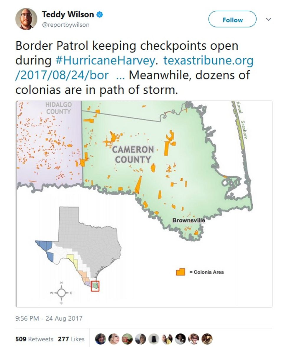 Reporter Teddy Wilson notes that many colonias -- unincorporated communities, often lacking basic services and inhabited by people in poverty who may or may not be citizens -- are located in the path of the storm: