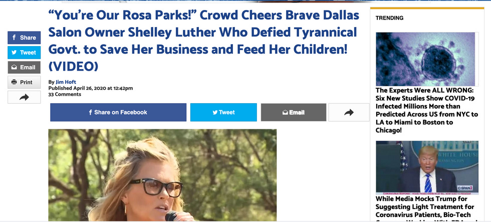 Gateway Pundit headline: "You're Our Rosa Parks!" Crowd Cheers Brave Dallas Salon Owner Shelley Luther Who Defied Tyrannical Govt. to Save Her Business and Feed Her Children!
