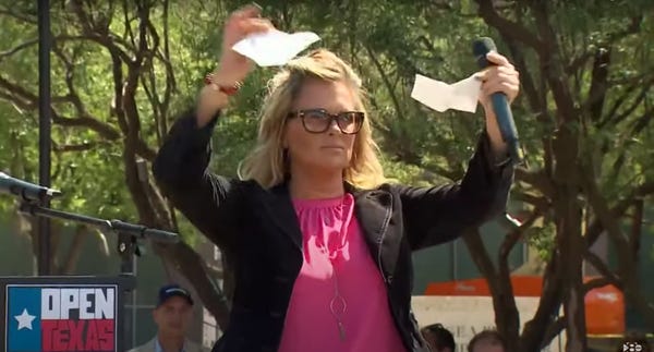 And who is the latest Right Wing Rosa? It is Shelley Luther, a salon owner from North Dallas, Texas who wants to keep her salon open even though it's entirely impossible to cut someone's hair from six feet away, even if one is a professional knife thrower (I used to know a guy — super nice , would not have let him cut my hair).