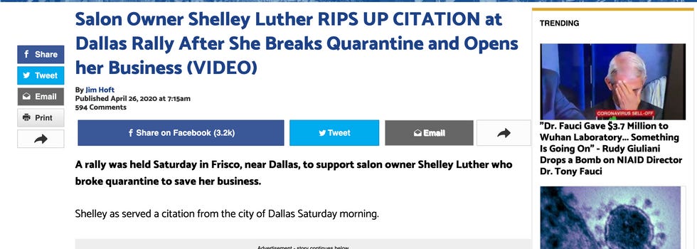 Gateway Pundit headline; Salon Owner Shelley Luther RIPS UP CITATION at Dallas Rally After She Breaks Quarantine and Opens her Business