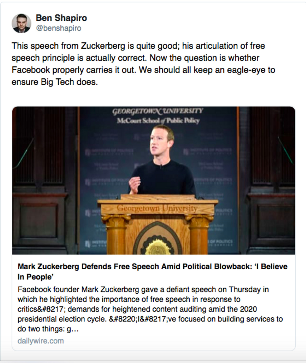 Conservatives now claim Zuckerberg is standing on "principle" against political censorship. The true villains are Alexandria Ocasio-Cortez and Elizabeth Warren. Zuckerberg is either complicit in conservative efforts to leverage social media for their own ends or incredibly naive. It's hard to say when this is the sort of nonsense he tells people these days: