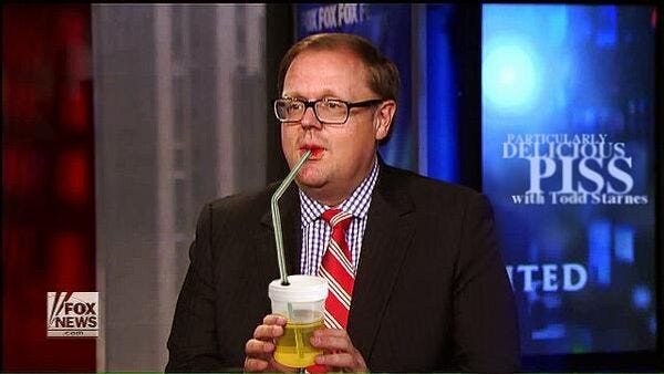 Scribbling madly, courageous holy war journalist Todd Starnes recorded it all, stopping only to take sips of his own urine from the thermos that was his constant companion. Small blessings; at least no one judged him for that now.