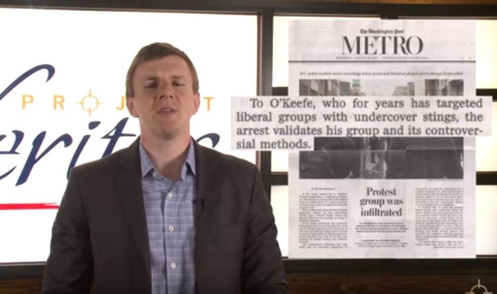 O'Keefe can't get even basic matters right: He starts his Ominous Narrator schtick with a lie, saying WaPo had "applauded me personally" in its coverage of his group's infiltrating activists who planned to disrupt the inauguration. After all, WaPo had written that the action "validates his group and its controversial methods." The humblebrag is a bit undercut by the onscreen excerpt from the story, which actually didn't editorialize or applaud O'Keefe, but instead said that O'Keefe himself considered his actions validated: