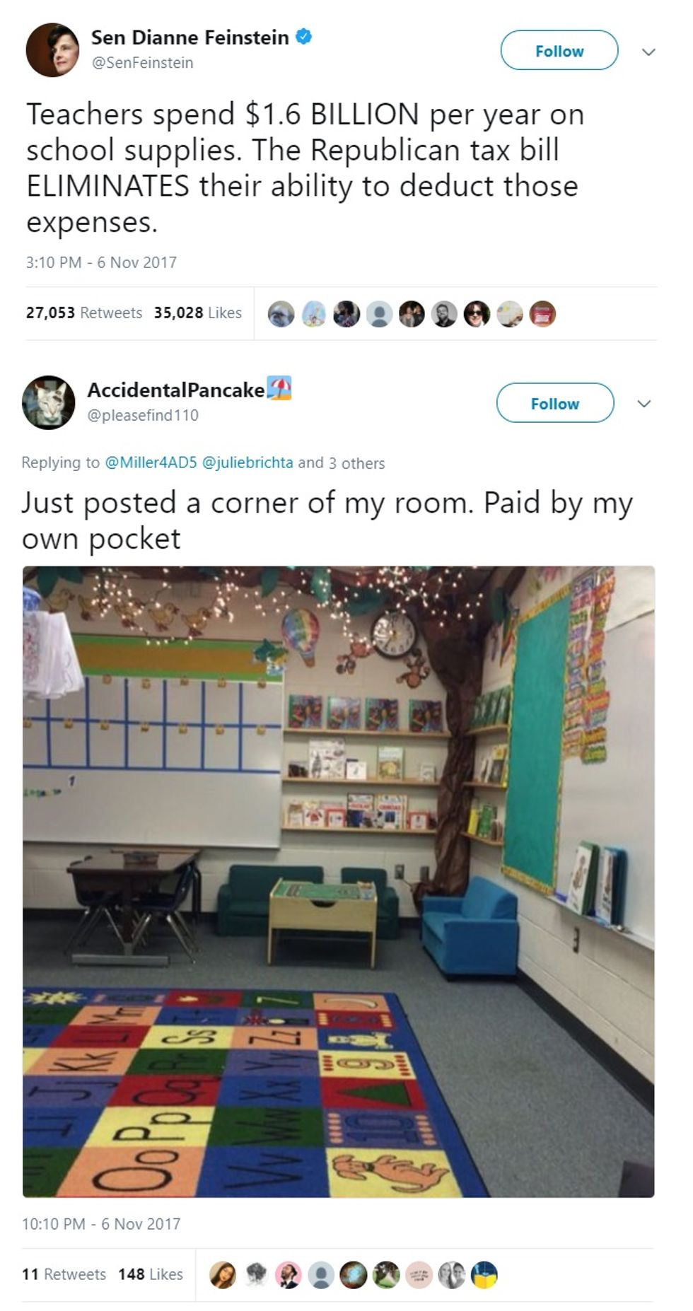 You want a little more angry-making? How about the elimination of the expense deduction for teachers? That's going to be bad, as California Democratic Senator Dianne Feinstein points out. We've added on one of the replies, from a Texas teacher whose classroom is likely to become a little less wonderful if this crap passes: