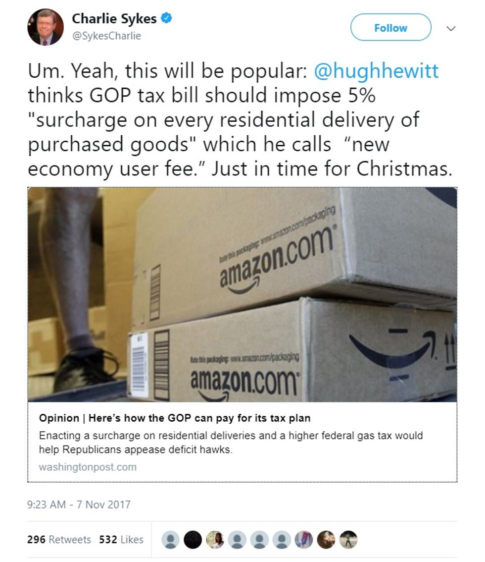 In a Washington Post piece, Hewitt offers a solution to the big revenue gaps the giant tax cut for the rich will cause: How about we kill Obamacare's individual mandate, raise the gas tax, and impose a 5% fee on all deliveries of goods sold online? Of the three, we can actually get behind the gas tax idea, because anything that pays for infrastructure and encourages fuel efficiency makes sense. Hewitt claims killing the individual mandate (which would cause ACA premiums to spiral out of control) would somehow save money, which ignores that tax subsidies for enrollees would also go through the roof -- at least until Rs kill the ACA altogether and then no lower-income people will ever get sick again, ever.