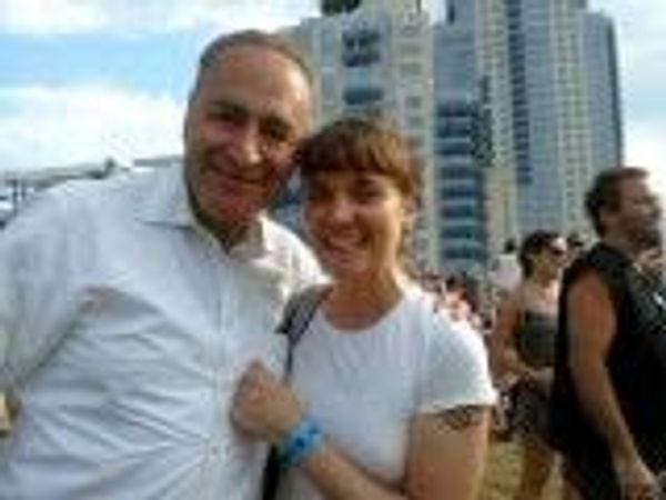 This was Sunday at a free, outdoor show (Deerhoof & Xiu Xiu played Joy Division's entire Unknown Pleasures album!) at Williamsburg's East River State Park. I think somehow Schumer was responsible for keeping the show from getting canceled (bribed/threatened NY State Senate with sexual favors? Just sayin'). In return, he was allowed to walk around the crowd for a few minutes. Pretty much no one knew who he was. I was drunk and suffering sunstroke, so of course I mobbed him and demanded his picture. I was supposed to be giving a thumbs-up, but wasn't quite able to manage it -- I look like I'm either clutching his fancy button-down, or giving him a companionable punch in the ribs, as if to say, "Oh Chuck, who really needed financial regulatory reform anyhow?"