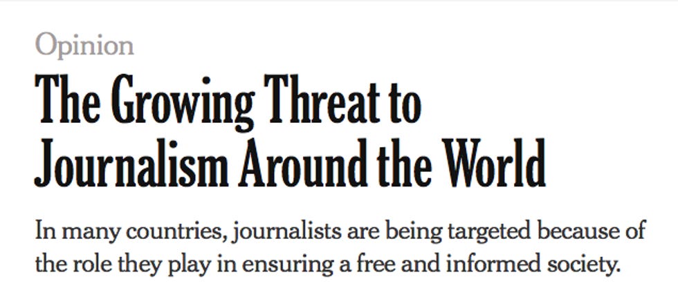 Early this year, Times correspondent David Kirkpatrick was held for hours in Cairo and later deported. This was apparently payback for revealing embarrassing information about the Egyptian government (probably that its dictator hangs out with Donald Trump). The Times protested Kirkpatrick's treatment to a senior official at the US Embassy in Cairo. He was unmoved.