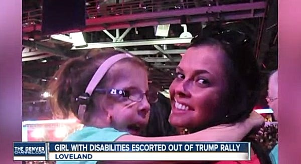 STOP THE PRESSES AND HOLD ON TO YOUR ASSES, we've got a #clickbait story for you! We saw a !!!1RawStory!!11!! headline that says, "Trump fans heckle 7-year-old girl with disabilities for trying to leave Colorado rally early," and we were all ready to be like AW NAW MOTHERFUCKER WHAT THE FUCK IS WRONG WITH THESE FUCKIN' PEOPLE? But we read the source piece and found what happened was that a nice undecided voter named Jennifer Mau went to check out the Trump rally in Loveland, Colorado, but decided to leave early with her disabled 7-year-old daughter. Someone in the section where they were sitting -- which was full of other disabled people -- was unkind about them leaving, and mama got a bit pissed off:
