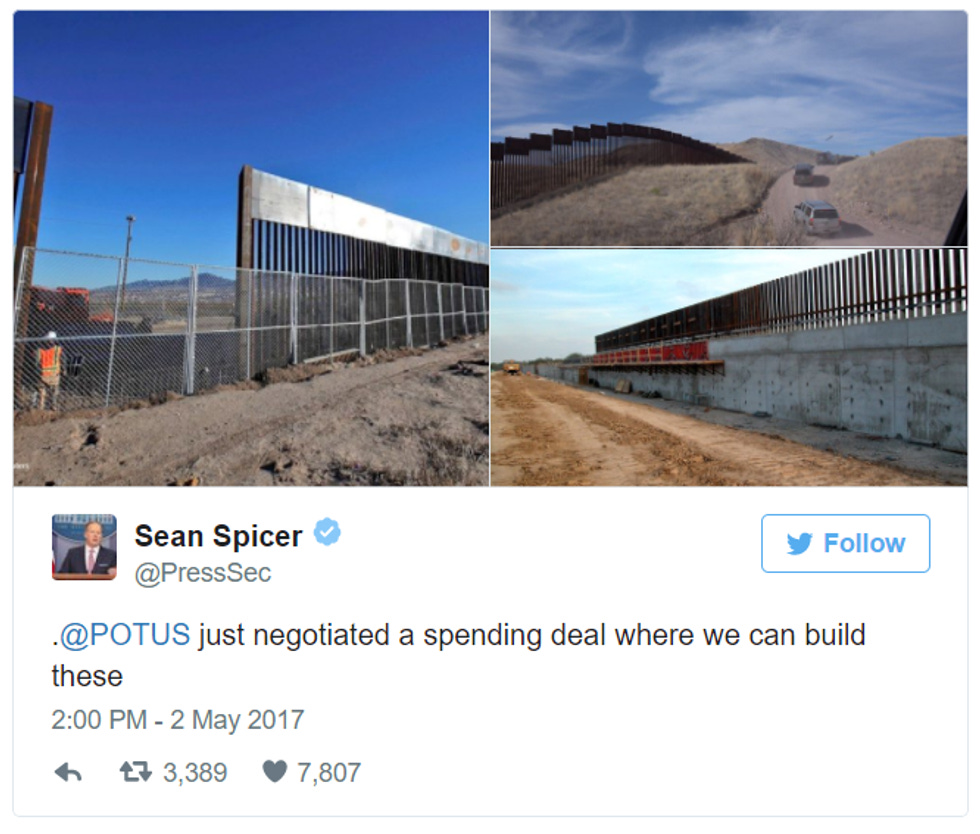 And even worse, Press Secretary Sean Spicer did a tweet Tuesday where he tried to pretend Daddy is building a wall, which is a big lie, because he didn't even say "wall":