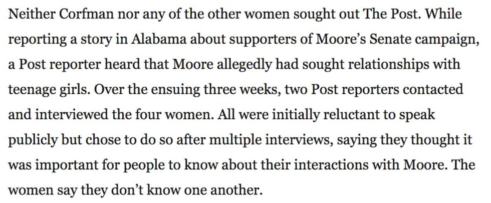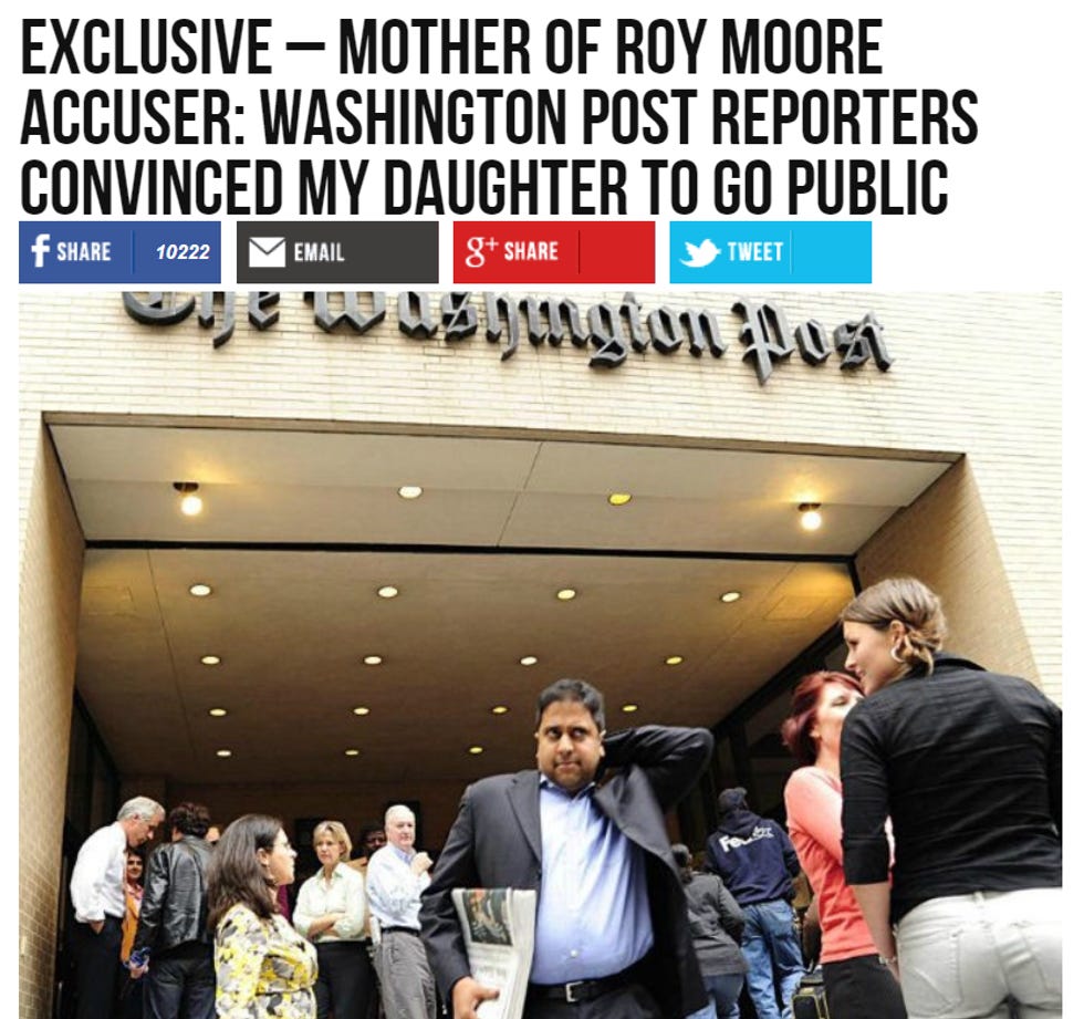 Of course, we must note that Breitbart seems to be conceding that Corfman's account is true , since its headline does not say " Washington Post convinced lady to make up child molesty stories about Roy Moore." It says WaPo helped her come forward.