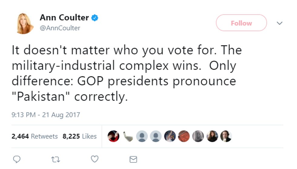 Hahahaha, because white supremacist shitheads like Ann Coulter are better at judging who pronounces foreign words correctly. Did you guys see Rachel Maddow's sick burn in her intro to Trump's speech Monday night, where she noted that Trump is prone to referring to people from Afghanistan as "Afghanis," which is equivalent to calling Americans "dollars"? It was just great and it renders Ann Coulter yet again a dumbfuck.