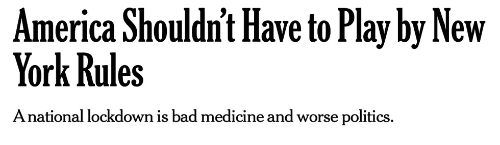 Stephens kicks off his column by kicking New York when its down. He implies New Yorkers are so full of themselves they are forcing America to needlessly hide in their homes. This doesn't make any sense, and his New York-bashing argument is itself New York-centric. California was the first state in the nation to issue a stay-at-home order. California even closed its schools sooner than New York.