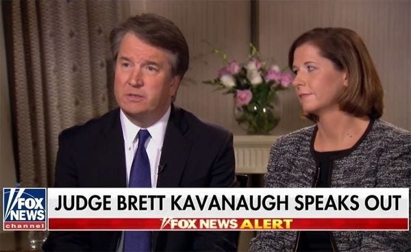 An interview whose very existence, we'd like to remind you is not the least bit normal at all. A Supreme Court nominee has never before gone on the talking picture box to try to gin up public support, in case you'd forgotten. Isn't having an official state TV channel wonderful? As your attorney, we advise you to watch at least a few minutes of the interview so you can get a sense of just how robotic Kavanaugh's performance is; sure, he's a judge, not a TV guy, but the effect is less "nerd who is bad at talking" than "guy who's been coached to hit several main points, and please remember to mention God, OK?"