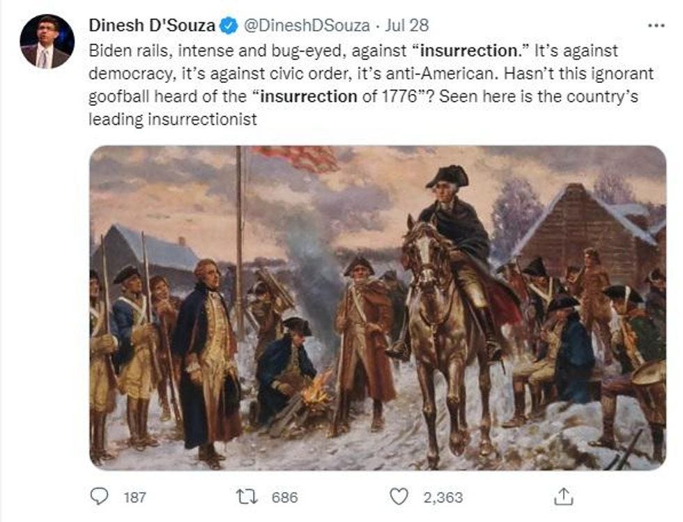 D'Souza was pardoned by Donald Trump in 2018 for being a real patriot who merely ignored election laws because he was helping a friend, and certainly has never tried to play off his own privilege apart from reminding the world at every opportunity that he went to Dartmouth and is a very successful rightwing producer of fake documentaries and lying book-shaped objects. More recently, D'Souza has argued that armed insurrection against the US government is perfectly fine, because wasn't George Washington an armed insurrectionist?