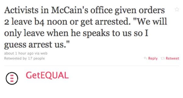 It appears that a smattering of homosexual activists with the group GetEqual are just kickin' it in Old Walnuts' Phoenix office until he repeals Don't Ask, Don't Tell. As if McCain didn't have enough on his plate these days, like a re-election campaign that only matters to him and no one else at all. Who knows if McCain was or will be able to get these damn gays offa his linoleum lawn by the end of the day. [ Towleroad via Pam's House Blend ]