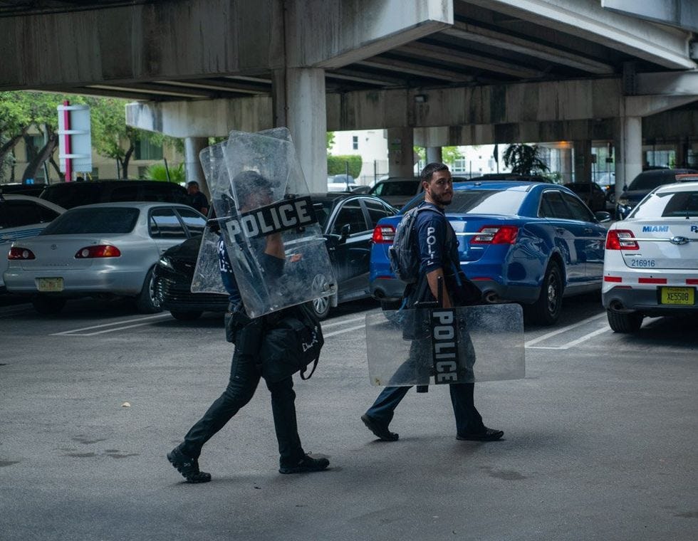Off-duty members of the Miami Police Department carry riot shields to police cruisers following the arraignment of former US president Donald Trump at the Wilkie D. Ferguson Jr. US Federal Courthouse in Miami, Florida, on Tuesday, June 13, 2023.