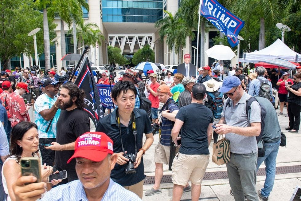 Reporters and supporters of former president Donald Trump mass outside the Wilkie D. Ferguson Jr. US Federal Courthouse in Miami, Florida, on Tuesday, June 13, 2023. Early in the morning, the scene was calm and dominated by dozens of news crews from all over the world. Around 11 a.m., dozens of Trump supporters began to arrive, some via a chartered bus that left from a Walmart parking lot in Orlando. Though many supporters mostly ignored members of the press, a number of agitators repeatedly harassed reporters, photographers, and smaller news crews. Concerned over a number of threats circulating through social media, a number of larger news crews hired private security to guard field studios and personal belongings. Throngs of crews arrived days in advance to set up tents, lighting, and sound equipment along the shaded north side of the courthouse grounds.