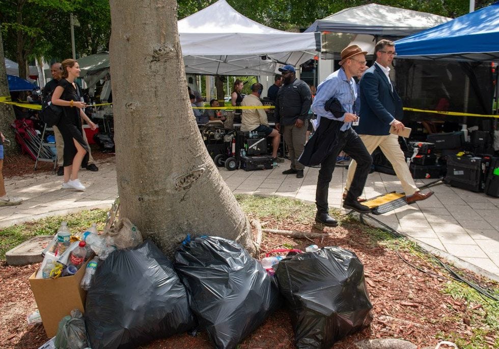 New York Times journalist Glenn Thrush, left, walks past a pile of trash left by members of the media and Trump supporters outside of the Wilkie D. Ferguson Jr. US Federal Courthouse in Miami, Florida, on Tuesday, June 13, 2023. While a number of news crews and supporters attempted to keep the grounds free of litter and debris, others simply threw half-empty bottles of water on the ground with coffee cups and fast-food wrappers.