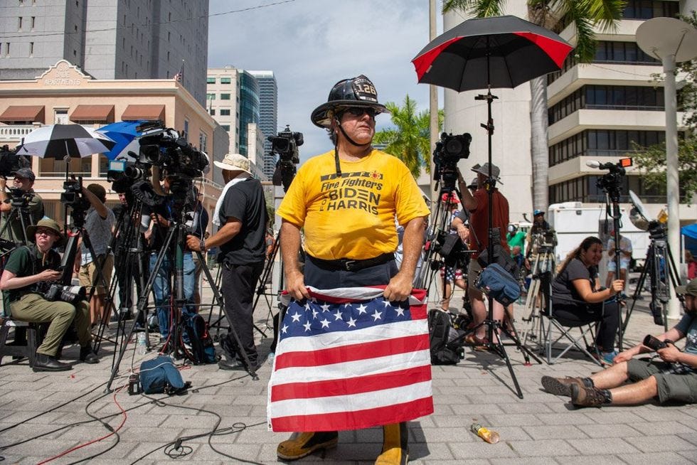 Luis Garcia, 57, of South Florida, stands in front of camera crews waiting to see if lawyers for former president Donald Trump will address the crowd assembled outside of the Wilkie D. Ferguson Jr. US Federal Courthouse in Miami, Florida, on Tuesday, June 13, 2023, after Trump was arraigned on charges of espionage and obstruction of justice. A 28-year member of the fire and rescue service, retired US Marine, and self-described lifelong Republican, Garcia left the party in 2015 because of Trump's candidacy. Garcia describes himself as a "middle of the road person," and complains about the acceptance of political extremism. Wearing a firefighter's union shirt, Garcia is a supporter of President Joe Biden and Vice President Kamala Harris. Garcia says that he showed up to the courthouse let people know, "One or two of us aren't afraid to be a visible minority," noting the wide support for Trump within the fire and rescue and law enforcement communities. Garcia calls Trump "a criminal sociopath" who has "torn us apart."