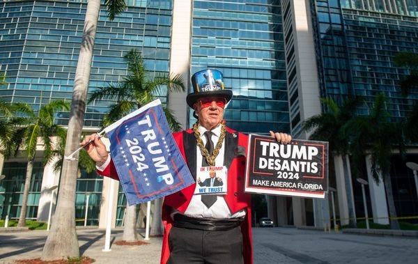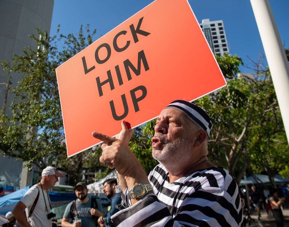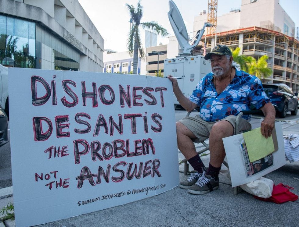 Donald Trump supporter Bob Kunst, 81, of Miami, sits in front of the Wilkie D. Ferguson Jr. US Federal Courthouse in Miami, Florida, on Tuesday, June 13, 2023. Knust wanted to protest "insane, fascist policies coming from the Demo-rat party," and is upset Republicans aren't "fighting back." A die-hard Trump supporter, Kunst does not like Florida Gov. Ron DeSantis, whom he criticized for attacking LGBTQ people in Florida. "[Florida is] the holy land for gay people," Kunst says, adding, "A license to discriminate leads to a license to murder. And once you open that door..."
