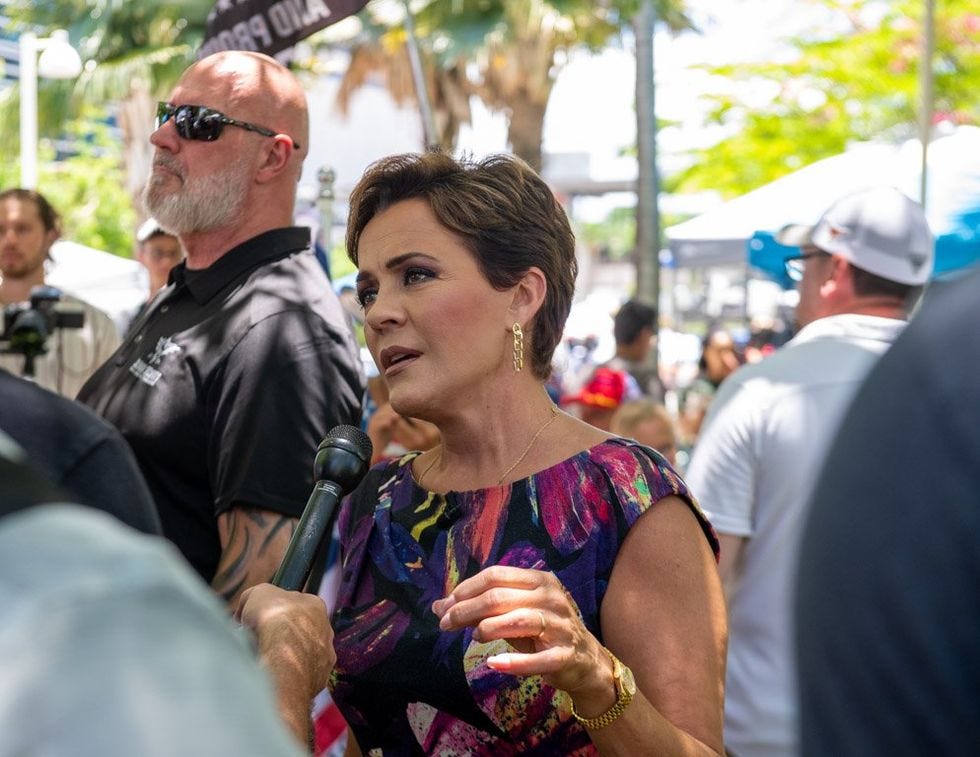 Kari Lake speaks to reporters outside the Wilkie D. Ferguson Jr. US Federal Courthouse in Miami, Florida, on Tuesday, June 13, 2023. A staunch supporter of gun rights, Lake often travels with a large private security detail that limits access to supporters and press.
