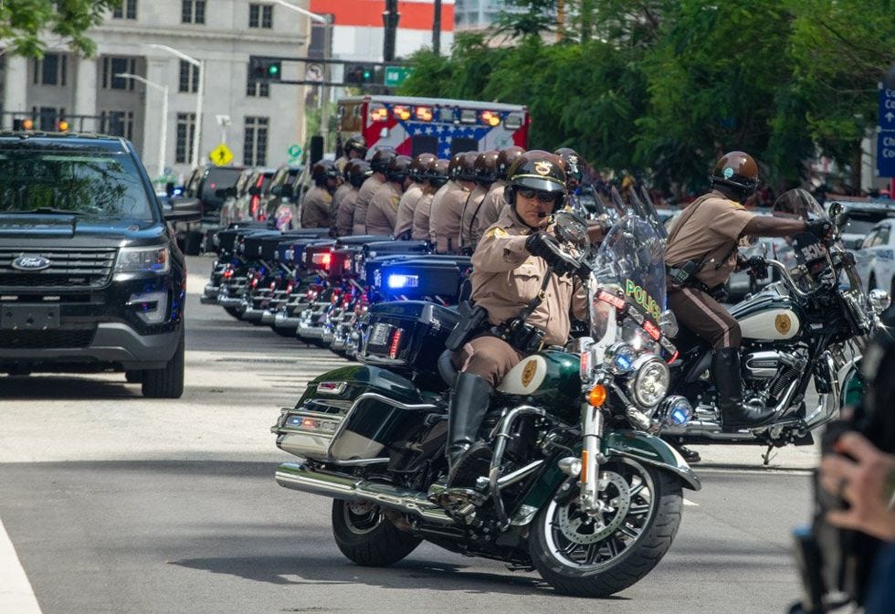 A phalanx of state troopers gets ready to lead a motorcade containing former president Donald Trump from the Wilkie D. Ferguson Jr. US Federal Courthouse in Miami, Florida, on Tuesday, June 13, 2023. A high security presence of state and local police prevented the press, supporters, and protesters from capturing images of Trump as he entered and exited the courthouse.