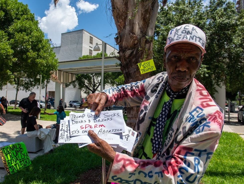 Xavier Presley, 67, of Miami, shows one of dozens of letters he intends to mail conservative politicians, including Supreme Court justices, governors, and members of Congress, while protesting outside the Wilkie D. Ferguson Jr. US Federal Courthouse as former president Donald Trump is arraigned on charges of espionage and obstruction of justice. "I'm just having fun," Presley says, ignoring the jeers of Trump supporters. "I have degrees in cooking and physical education," Presley boasts, adding that he cooked for former presidents Jimmy Carter, Ronald Reagan, and George H.W. Bush while working at the Hyatt Regency in Dallas.