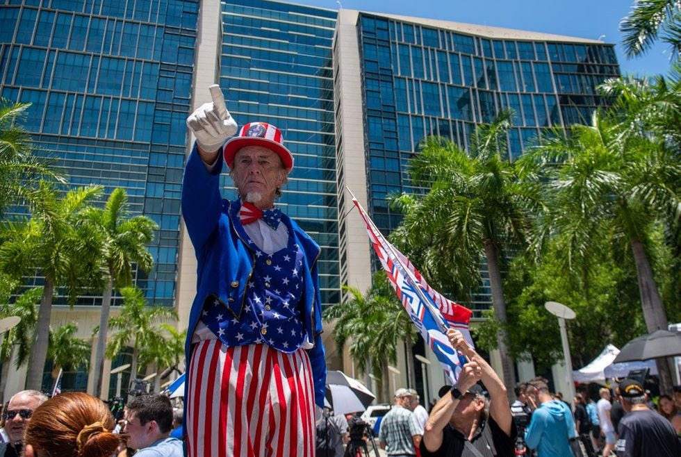 A traveling Trump supporter dressed as Uncle Sam points into the crowd outside the Wilkie D. Ferguson Jr. US Federal Courthouse in Miami, Florida, on Tuesday, June 13, 2023.