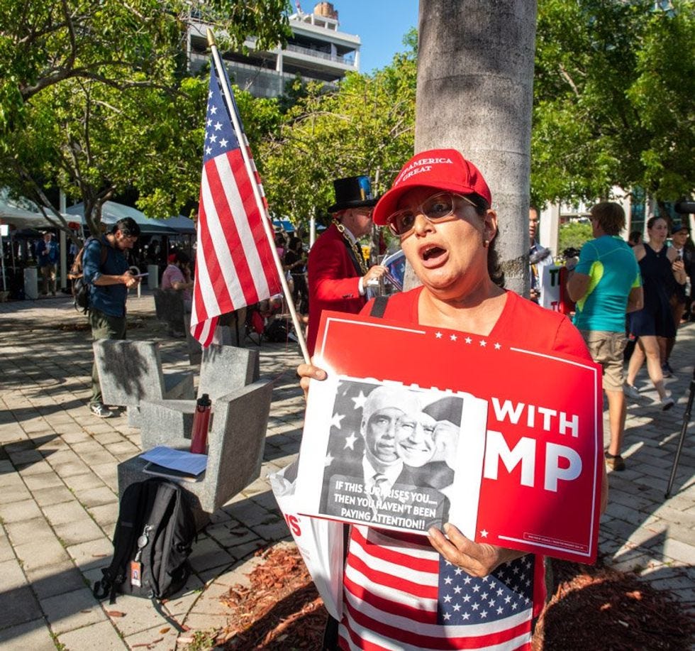 Esperanza Quant, a refugee from Nicaragua, yells about socialist governments to a throng of reporters assembled in front of the Wilkie D. Ferguson Jr. US Federal Courthouse in Miami, Florida, on Tuesday, June 13, 2023 for the arraignment of Donald Trump on charges of espionage and obstruction of justice. Quant called US President Joe Biden a socialist, insisting that his presidency was secretly a third term for Barack Obama, and said Americans don't understand what happens in socialist governments.