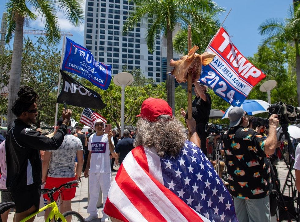 Osmany Estrada, center, 35 of Miami, carries a pig's severed head impaled on a large wooden spike. Wrapped in an American flag, Estrada is protesting the arraignment of former president Donald Trump outside of the Wilkie D. Ferguson Jr. US Federal Courthouse in Miami, Florida, on Tuesday, June 13, 2023. Estrada claims the severed head is an homage to Animal Farm and Lord of the Flies, adding, "They were about politics."