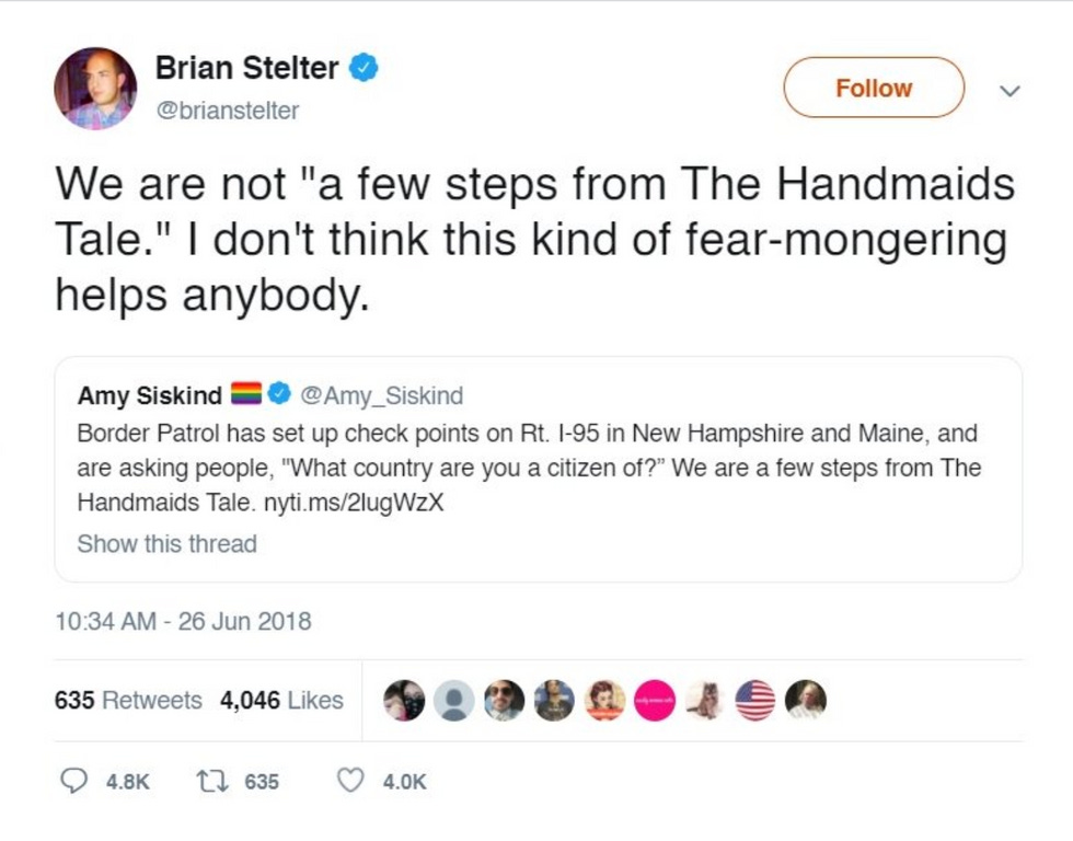 "We are not a few steps from 'The Handmaid's Tale'," Brian Stelter tweeted in 2018, "I don't think this kind of fear-mongering helps anything."