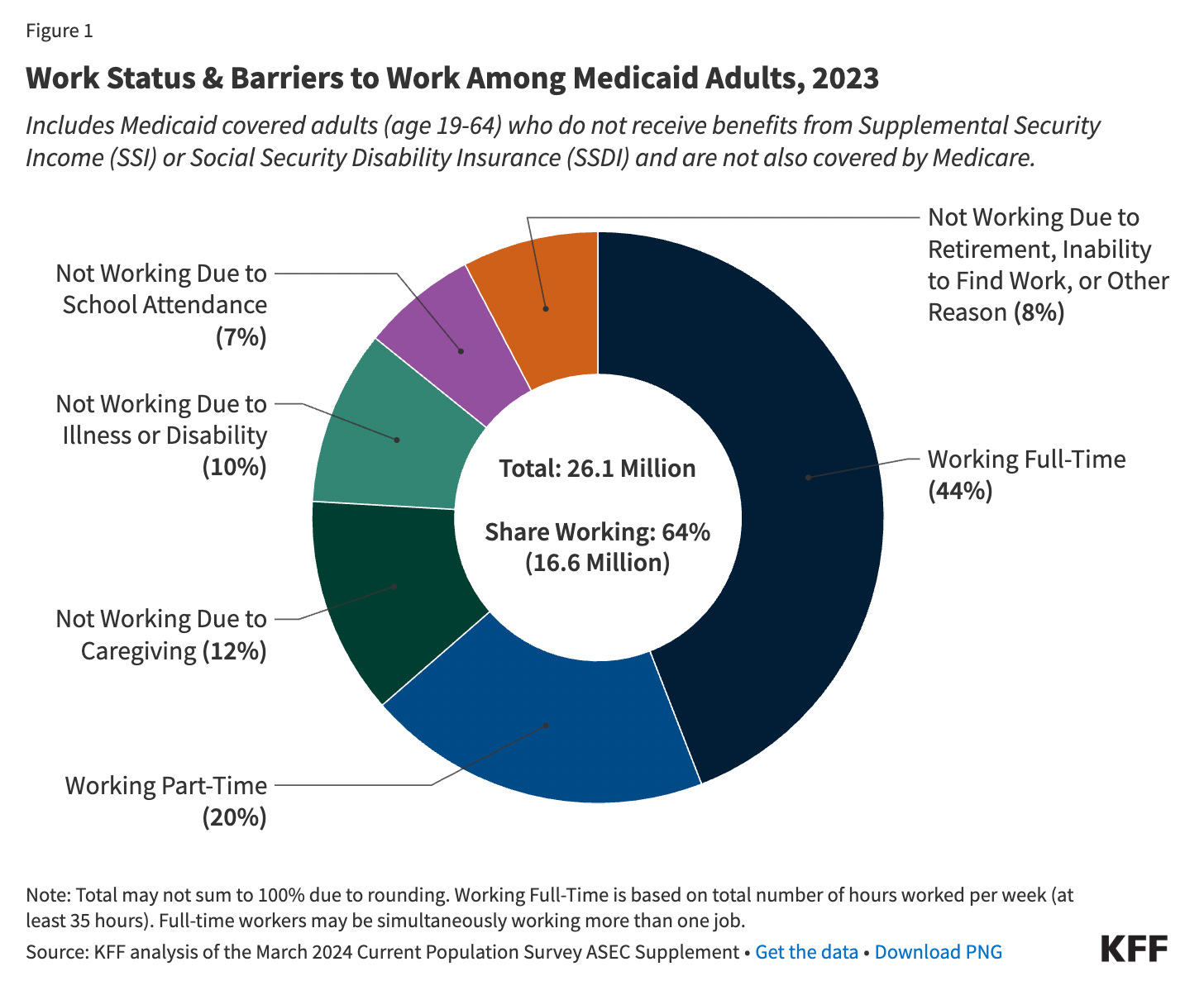 There are 71 million Americans on Medicaid. Of those 71 million, 41 million are adults. Of those 41 million adults, 26 million are working-age and not covered by SSI or disability insurance, which would denote … disability. Of that 26 million, 64 percent (or 16 million people) are already working full or part time; another 18 percent (or almost 5 million people) are students or caregivers. Another 10 percent (2.6 million people) are sick or disabled while not specifically receiving SSI (which is quite hard to get!). That leaves just eight percent — around two million — who are not working because they are retired or can’t find work or for some other reason.