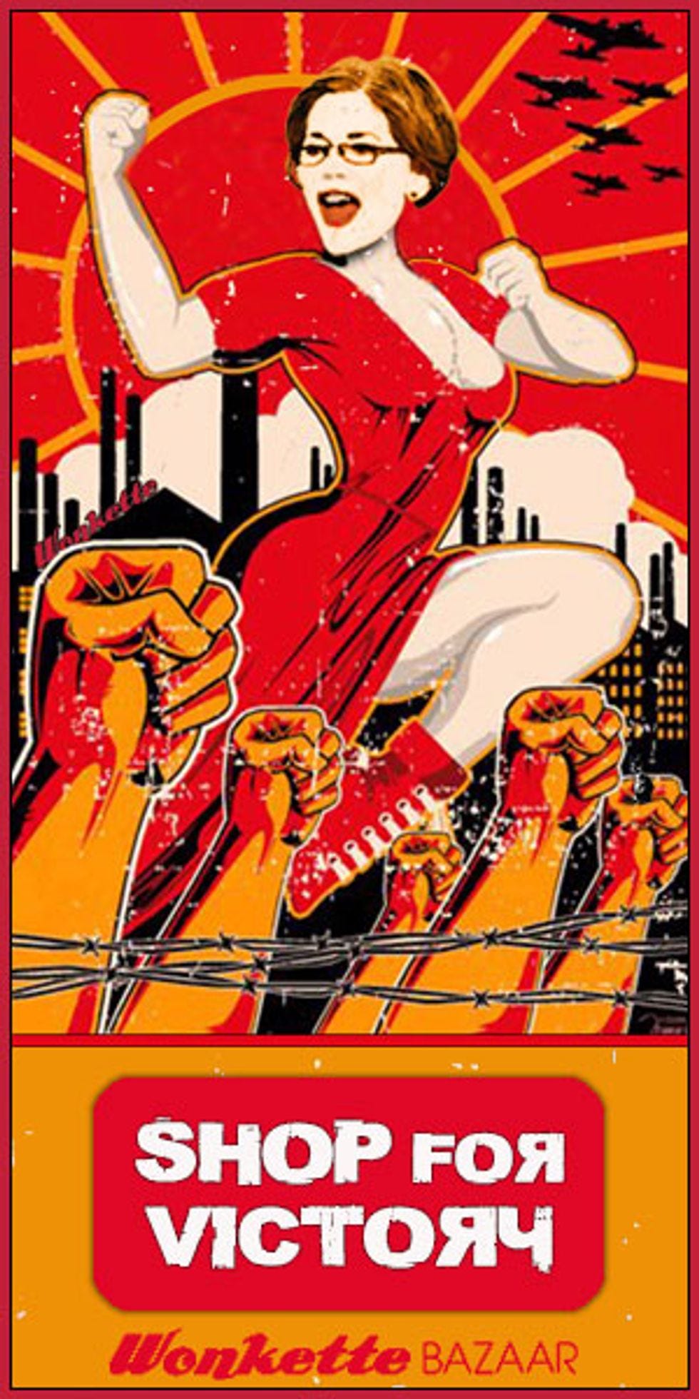 Now! Buy some women's Warren for Progress T-shirts or men's Warren for Progress T-shirts from the Wonkette Bazaar! If you have checked there, and we are out of your size, buy it from Redbubble instead! (We get a slightly smaller cut from our Redbubble store; at the same time, we will not fuck up your order, which happens more frequently than I'd like to admit! Lose-win!)