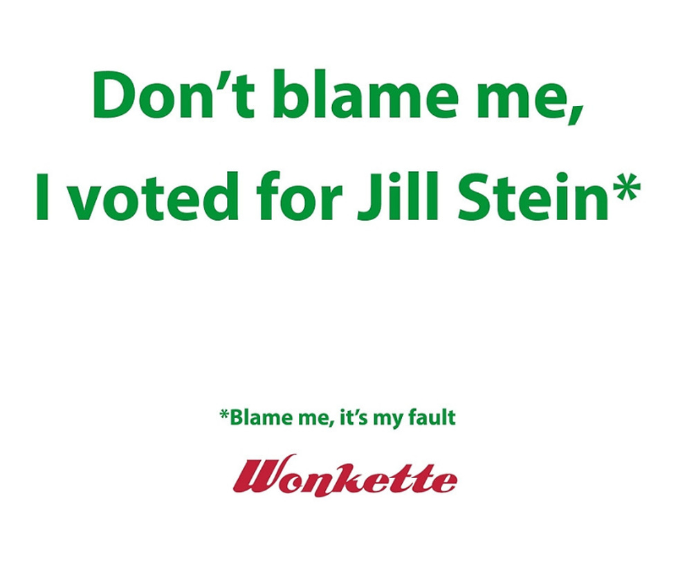 Here is a funny shirt! It says "Don't blame me, I voted for Jill Stein." But it is funny because it has an ASTERISK that says "Blame me. It's my fault." Nobody is buying those, I think because they can't see the asterisk part in the picture. BUT IT IS THERE!