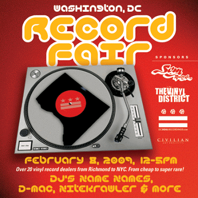 Som Records, one of DC's finest record stores, is hosting the fair in conjunction with DC Soul Recordings, The Civilian Arts Project and D.C. music blog The Vinyl District. Record dealers from New York to North Carolina will be in attendance, selling rare, used and new vinyl from all genres.