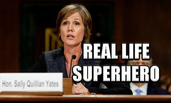 Well! Sally Yates was the one what got the fun job of mentioning to Team Trump that the FBI might have their National Security Advisor on tape whispering sweet nothings in Cyrillic. Lucky girl! But despite Yates's heads up on January 26 that Flynn was vulnerable to blackmail for lying to the Feds, he continued to receive classified briefings. Yates herself was fired four days later for having taken a first year ConLaw class.