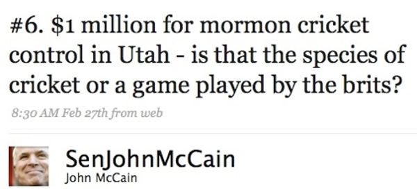 Mormon crickets: If you live, say, anywhere in the American West, you know these horrifying animals as a persistent cannibal scourge that can form a phalanx a mile across and two miles long, marching through the desert in search of food. If you are a senator "from" Arizona who grew up in Virginia and spent most of his life in Washington D.C., they are a punch line to a terrible joke.