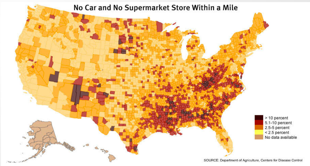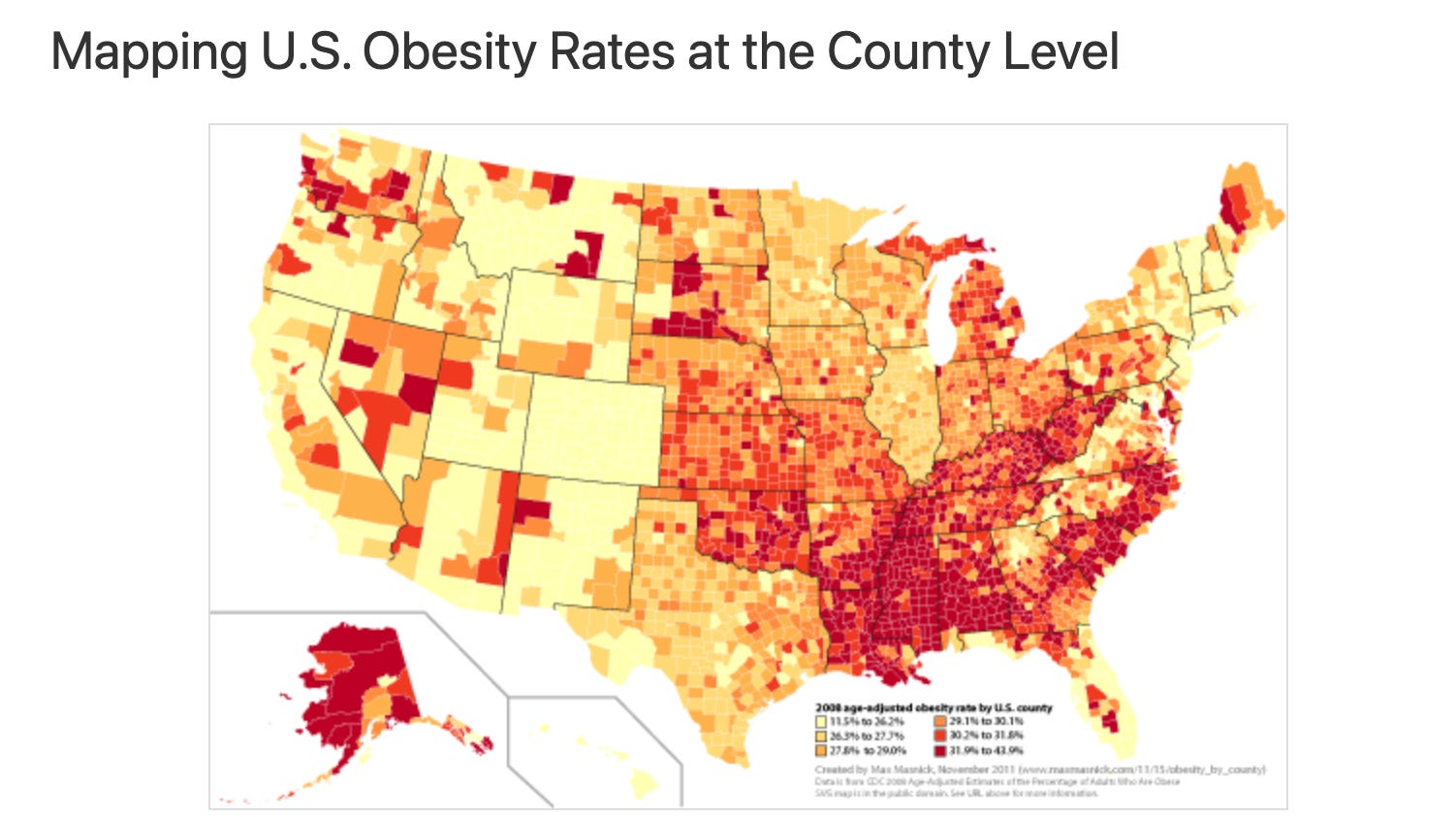 Now here is a map of obesity rates by county. To be clear — fat does not mean unhealthy, people can be healthy or unhealthy at any size, but it does pertain to the ability to afford and access healthy foods.