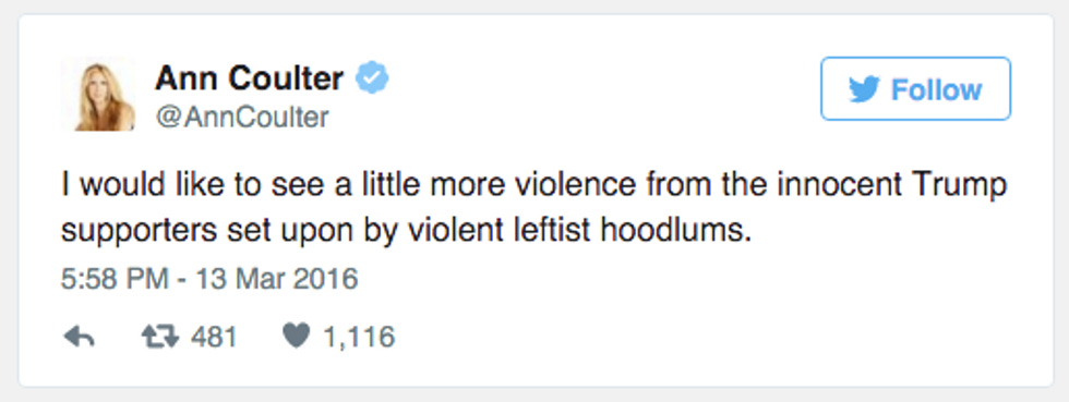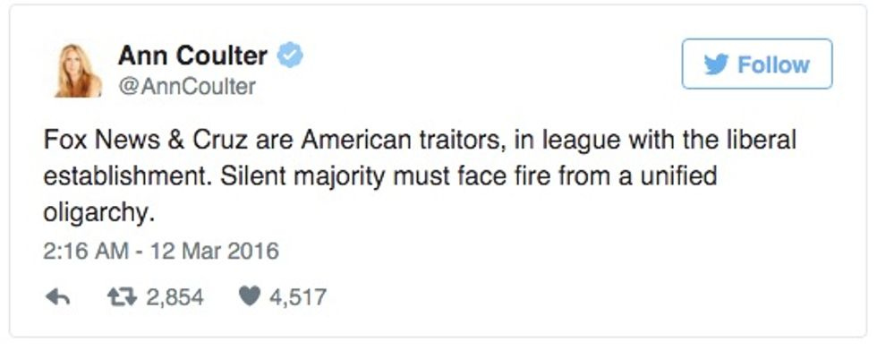 [contextly_sidebar id="vCJwoI9RSqxCkMnu7yRW6uHZs9F34iEK"]Remember when Ann Coulter was the shit? No, not when she was shitty. She's always that. But remember the heyday of the late nineties and early oughts, when you couldn't turn over a viciously nativist racist homophobic rock without finding Coulter underneath? Those days are -- thank sweet baby Jesus in heaven -- gone now, but Coulter's hunger for the limelight isn't, which means she has to keep hurling herself at the election news cycle in a desperate bid for relevance. Coulter must have been feeling very lonely this past weekend because she really went with a full court press, flitting hither and thither and Twitter and yon, spewing bile and nonsense and bilious nonsense all the way.