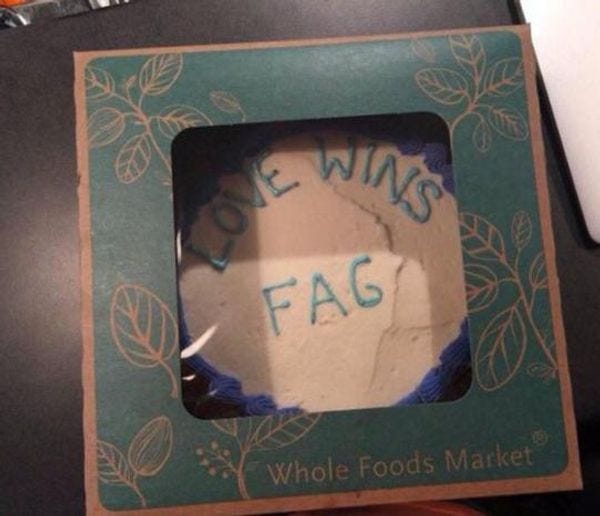 Yesterday morning, in the chatcave, we looked at a post from RawStory. A pastor had bought a cake from Whole Foods, which he'd had inscribed with the words "Love Wins," and then YouTubed himself looking through the cellophane window at the (still sealed!) cake. It said "FAG." That is not a nice thing to add to your cake, and the pastor was PISSED Y'ALL!